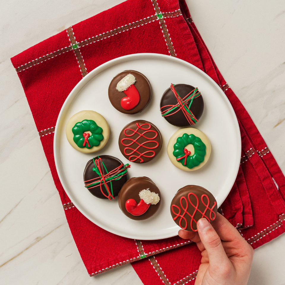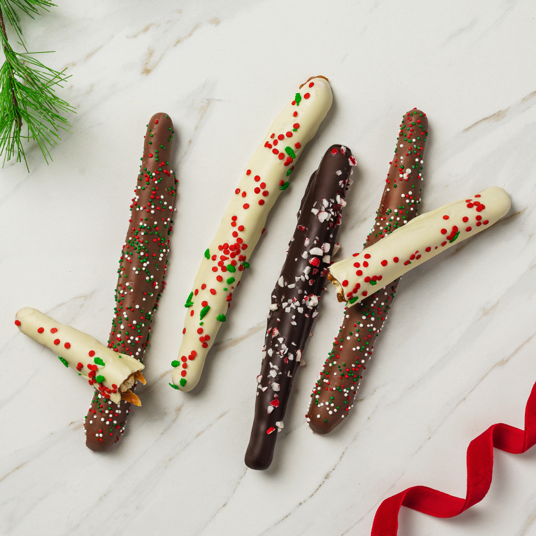 Holiday White Chocolate-Covered Mini Pretzel Twists, Holiday Chocolate Brittle Crunch, and Dark Chocolate-Covered Mini Oreo Cookies with Crushed Peppermint Candy—the perfect gift to give this holiday season!